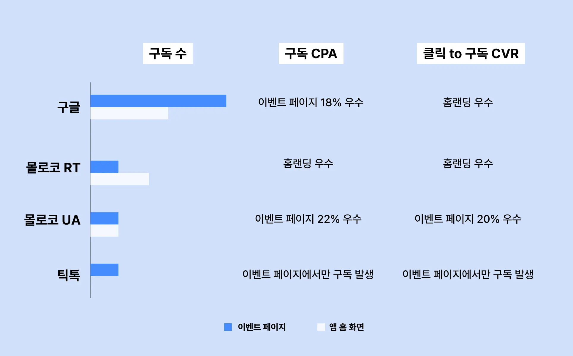 CVR의 경우, 두 랜딩에서 비슷한 효율이 확인되었으나 KPI인 구독 CPA를 달성하는데 ‘이벤트 페이지’의 효율이 더 우수했습니다.