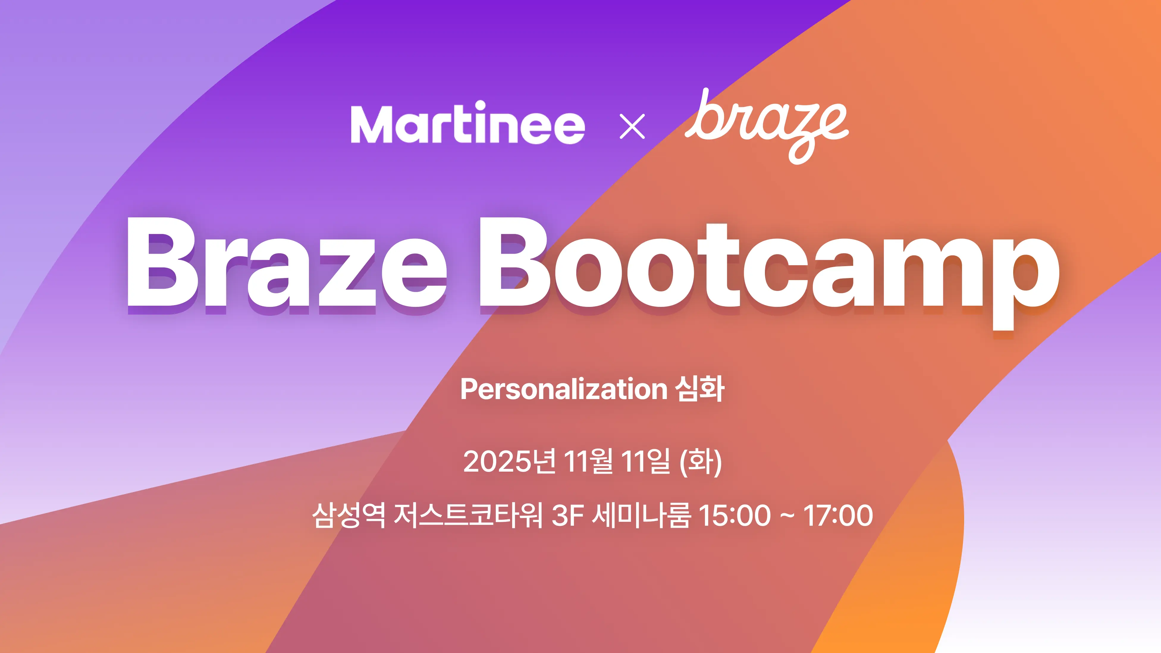 혹시 브레이즈를 도입했지만, 개인화 기능을 제대로 활용하지 못하고 있다고 느끼지는 않나요? 지금 마티니 브레이즈 부트캠프 에서 실무에 바로 적용 가능한 Personalization 전략을 배울 수 있습니다.